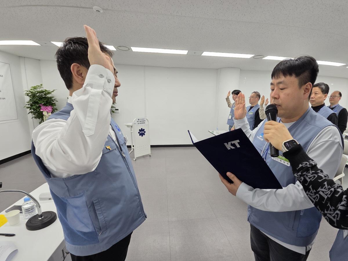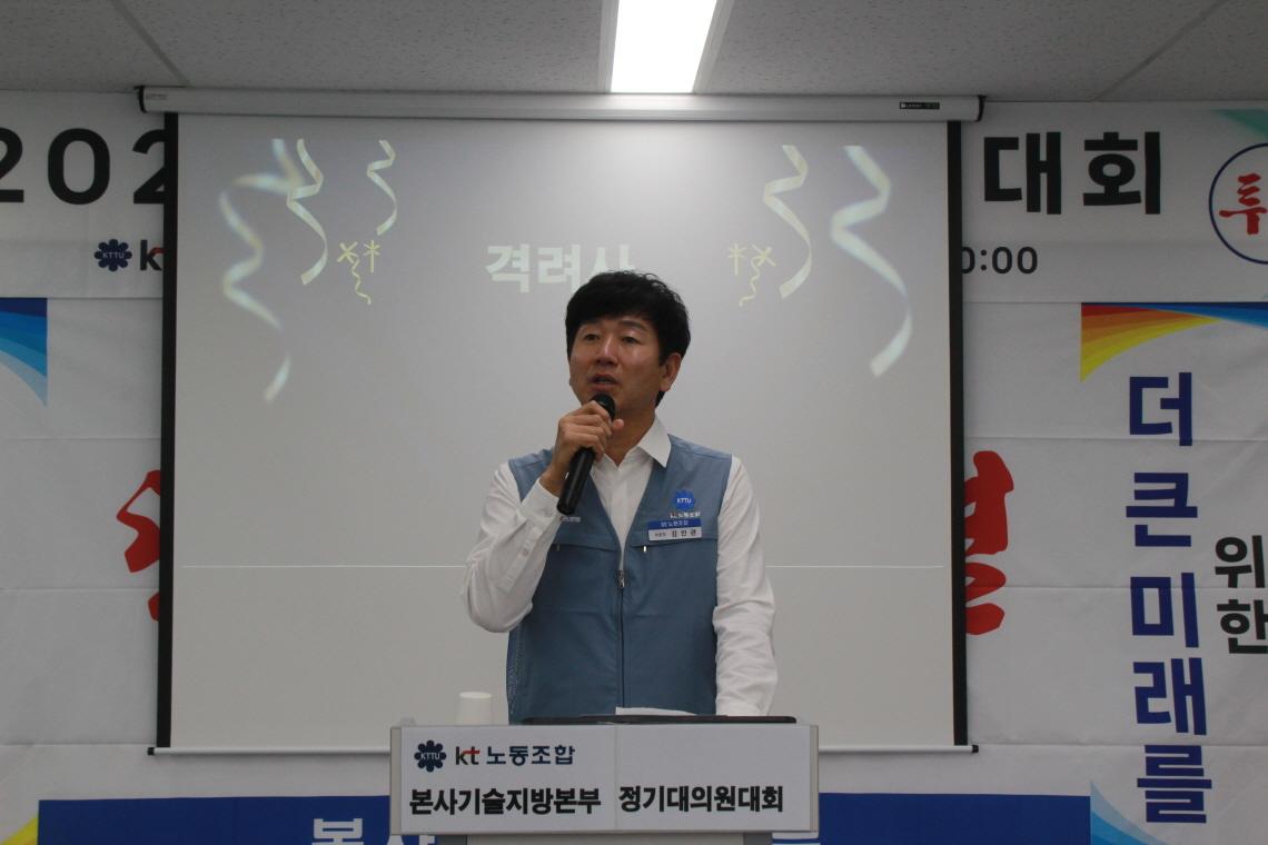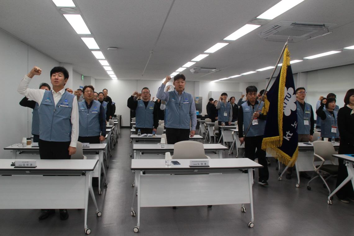 본사기술지방본부(위원장 노일철)는 2월 25일(수)에 '26년도 정기대의원대회를 개최하였다. 정기대의원대회를 격려하기 위해 kt노동조합 김인관 중앙위원장, 유희수 정책실장, 배준환 정책기획국장, 김배정 대외협력국장과 권혜진 네트워크전략본부장, 박순선 네트워크전략담당 등 사측 인사 6명이 참석하여 자리를 빛내 주었다.
