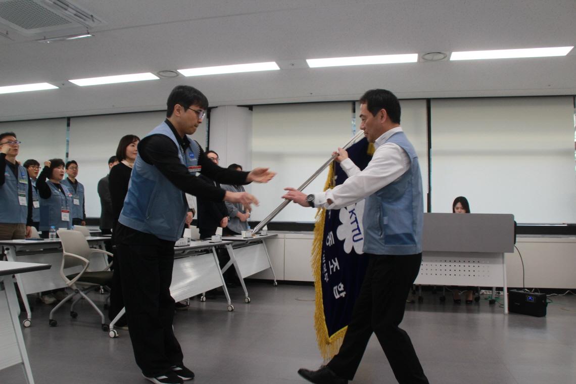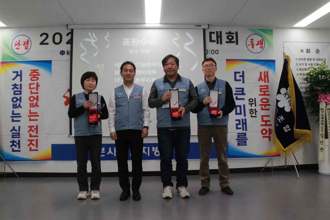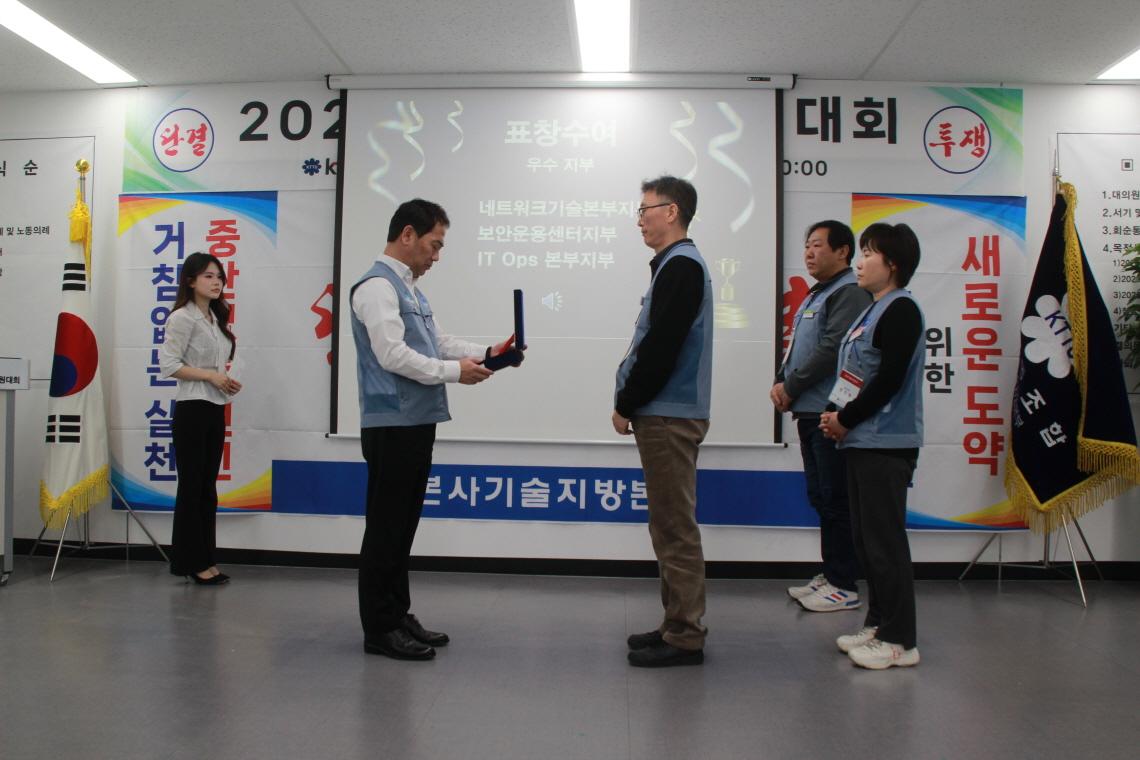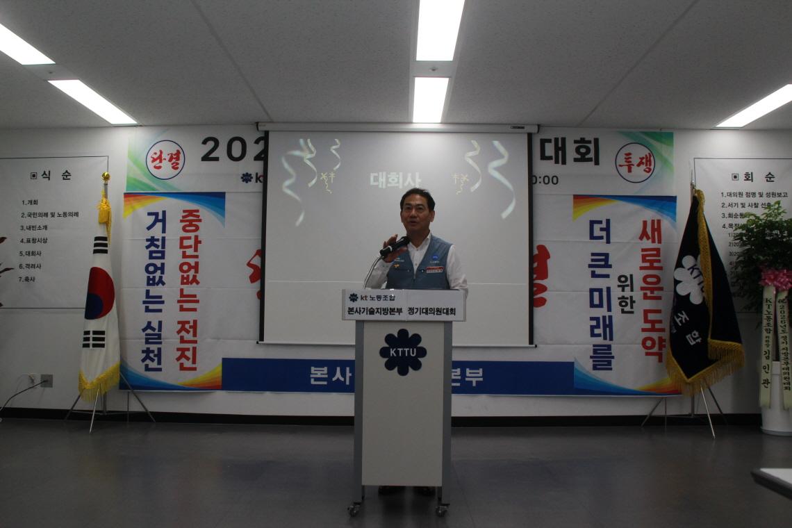 본사기술지방본부(위원장 노일철)는 2월 25일(수)에 '26년도 정기대의원대회를 개최하였다. 정기대의원대회를 격려하기 위해 kt노동조합 김인관 중앙위원장, 유희수 정책실장, 배준환 정책기획국장, 김배정 대외협력국장과 권혜진 네트워크전략본부장, 박순선 네트워크전략담당 등 사측 인사 6명이 참석하여 자리를 빛내 주었다.