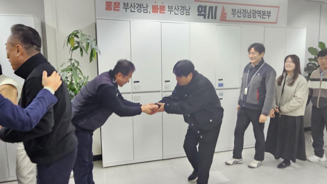 -이번 행사는 노사공동 신년맞이 케이터링 행사로 참여한 부산지방본부와 부산경남광역본부의 임원 및 직책자들이 한분 한분 조합원들과 악수를 하며, 덕담을 나누었으며, 다과를 가지고 삼삼오오 모여 조합원들의 담소자리도 마련되었다.