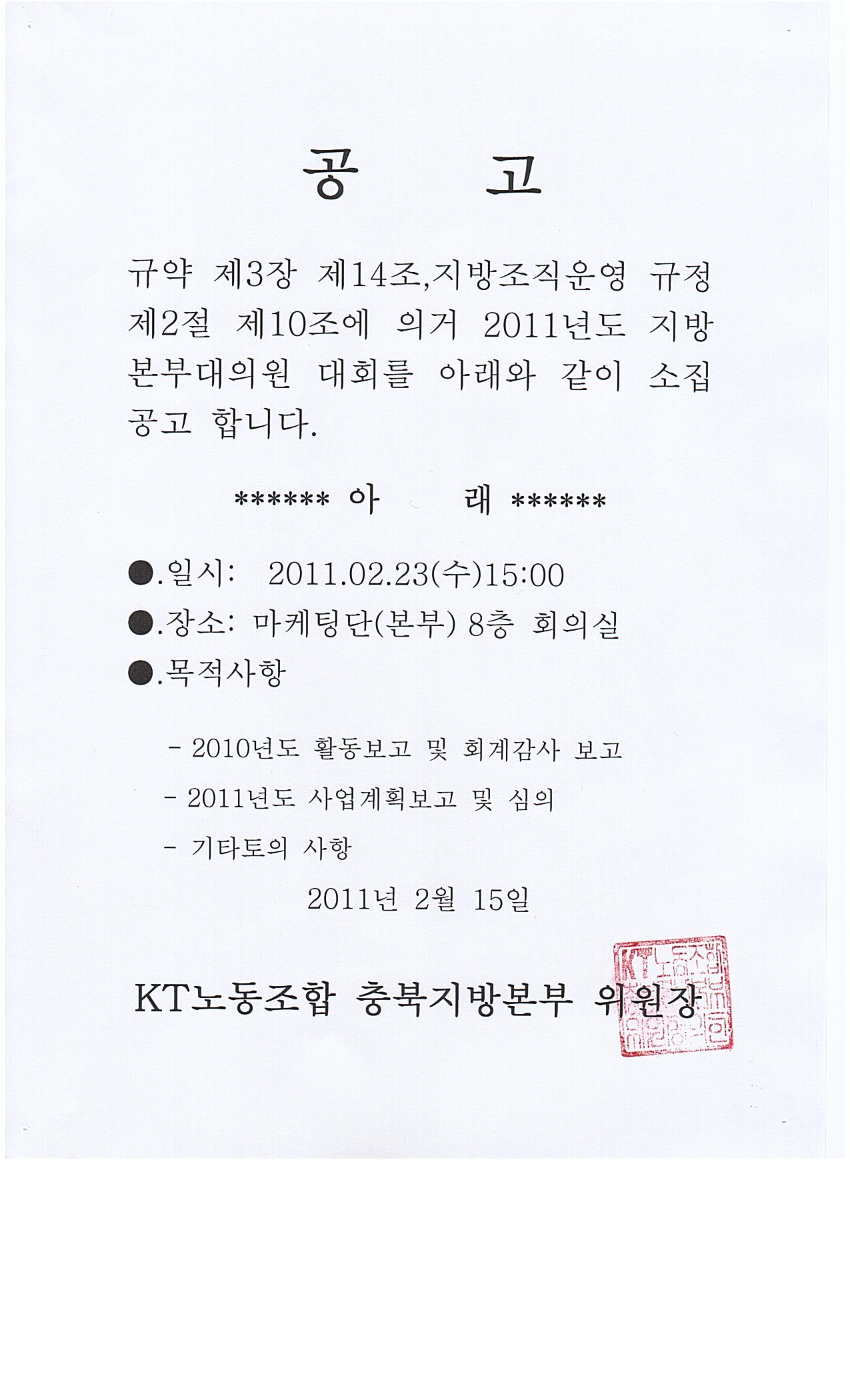^2011년 지방본부대의원대회 공고^^