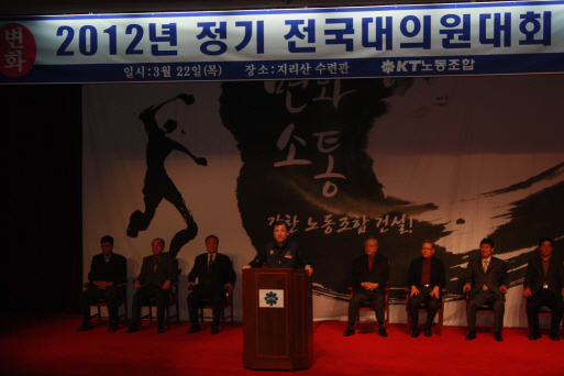 2012년 정기전국대의원대회는 조합 간부,각 단사 노동조합 위원장님, KT그룹노조 소속 위원장님, 그리고 이석채 회장님,서유열사장이 참석한 가운데 시작되었다. 이번 대의원대회는 11대집행부 첫 번째 대의원대회로 위원장님은 대회사를 통해 올 한해 “조직을 진단하고 혁신하여 조직을 강화하겠다,내부결속을 견고하게 다질것이다,감성경영을 지속적으로 시행하겠다”는 대회사를 하셨다.이날 상정된 4개의 안건을 심의.의결하였으며, 결의문 채택을 끝으로 마무리되었다.