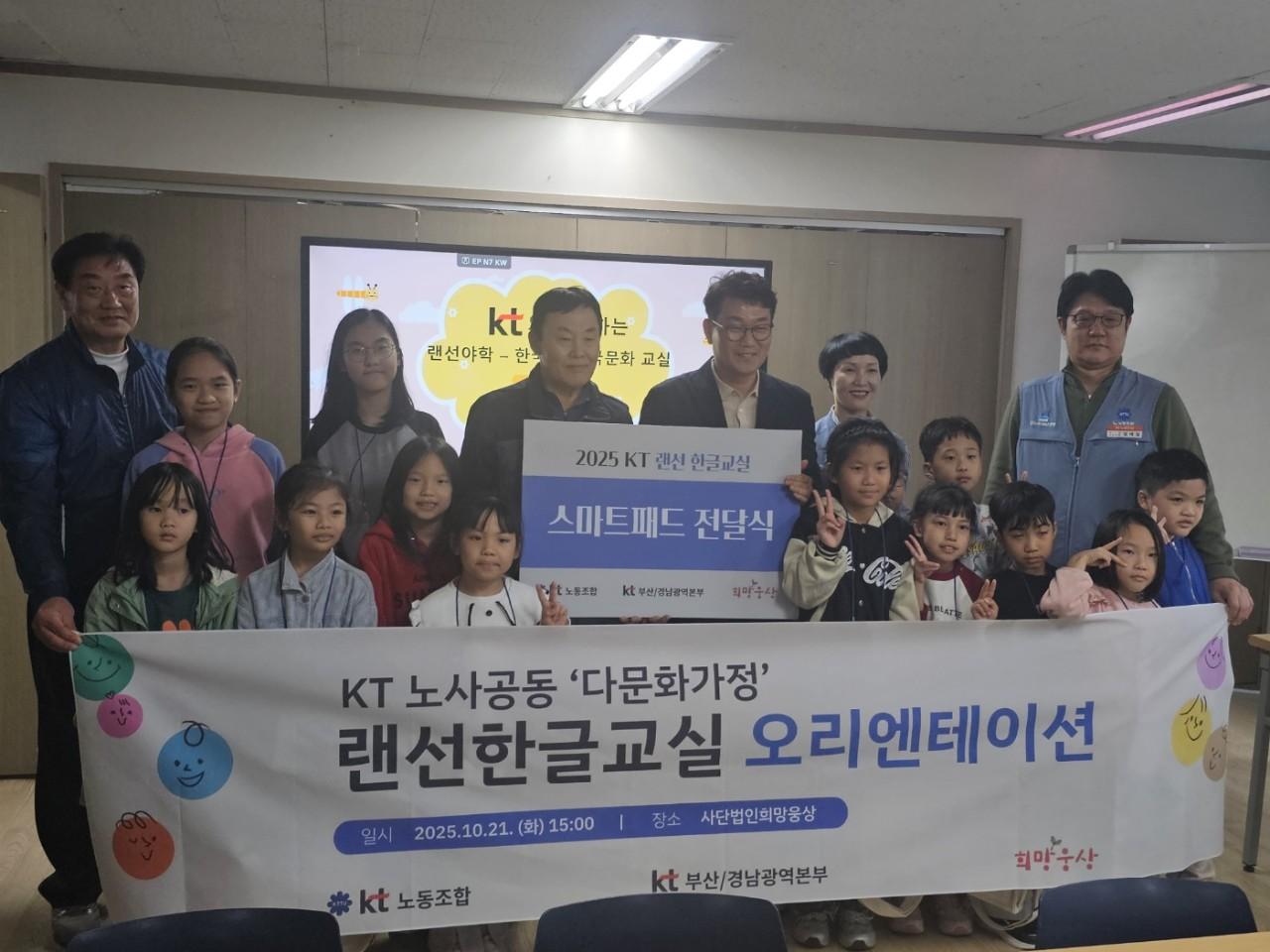-노사공동으로 시행되는 뜻깊은 행사는 KT노동조합 부산지방본부 조직국장, 여성국장이 참여하였으며, 그외에도 KT동부산지사장, 희망웅상대표, 상임이사등이 함께 하여 아이들의 한글 공부를 응원하였다.