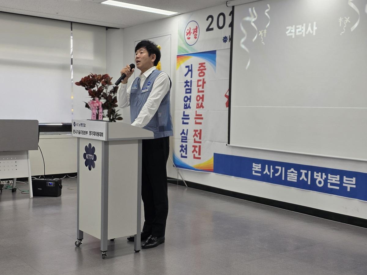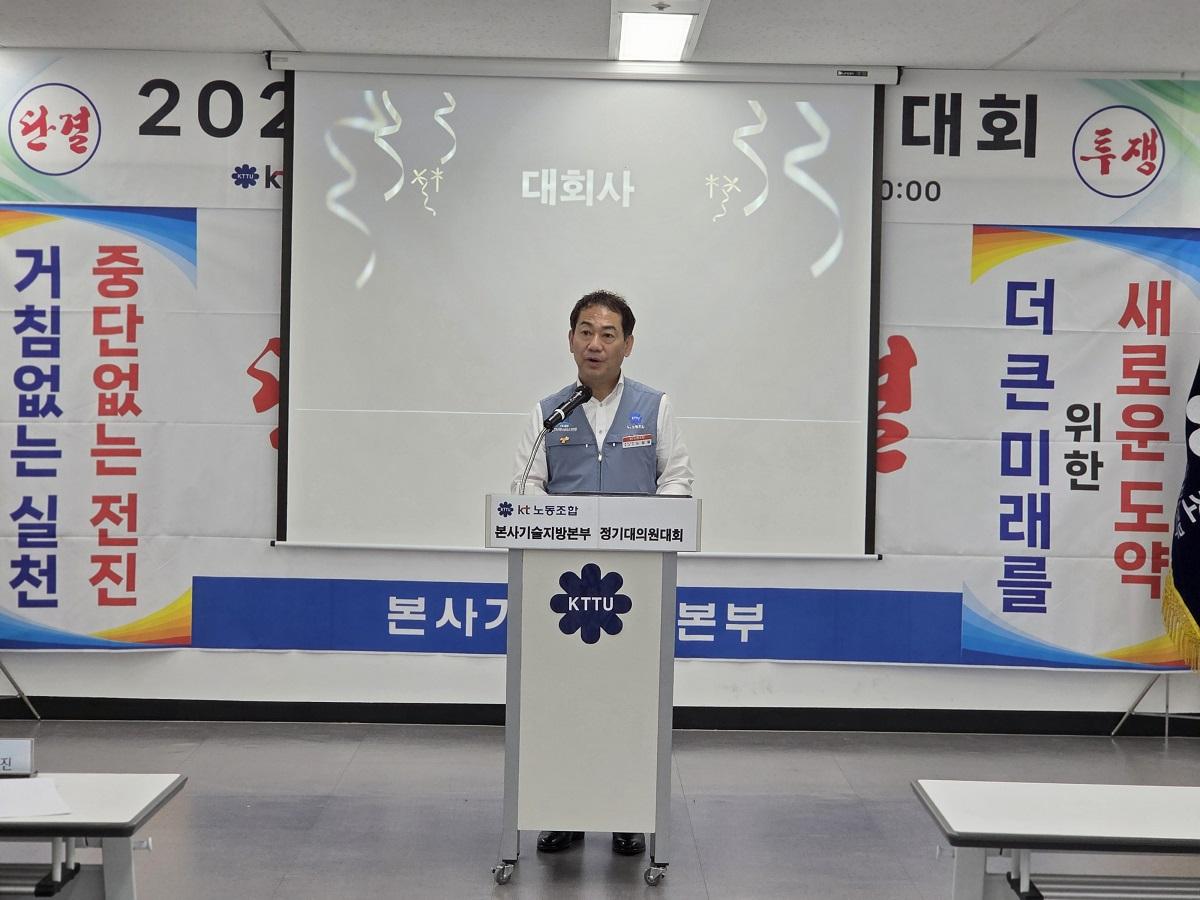 본사기술지방본부(위원장 노일철)는 2월 25일(수)에 '26년도 정기대의원대회를 개최하였다. 정기대의원대회를 격려하기 위해 kt노동조합 김인관 중앙위원장, 유희수 정책실장, 배준환 정책기획국장, 김배정 대외협력국장과 권혜진 네트워크전략본부장, 박순선 네트워크전략담당 등 사측 인사 6명이 참석하여 자리를 빛내 주었다.